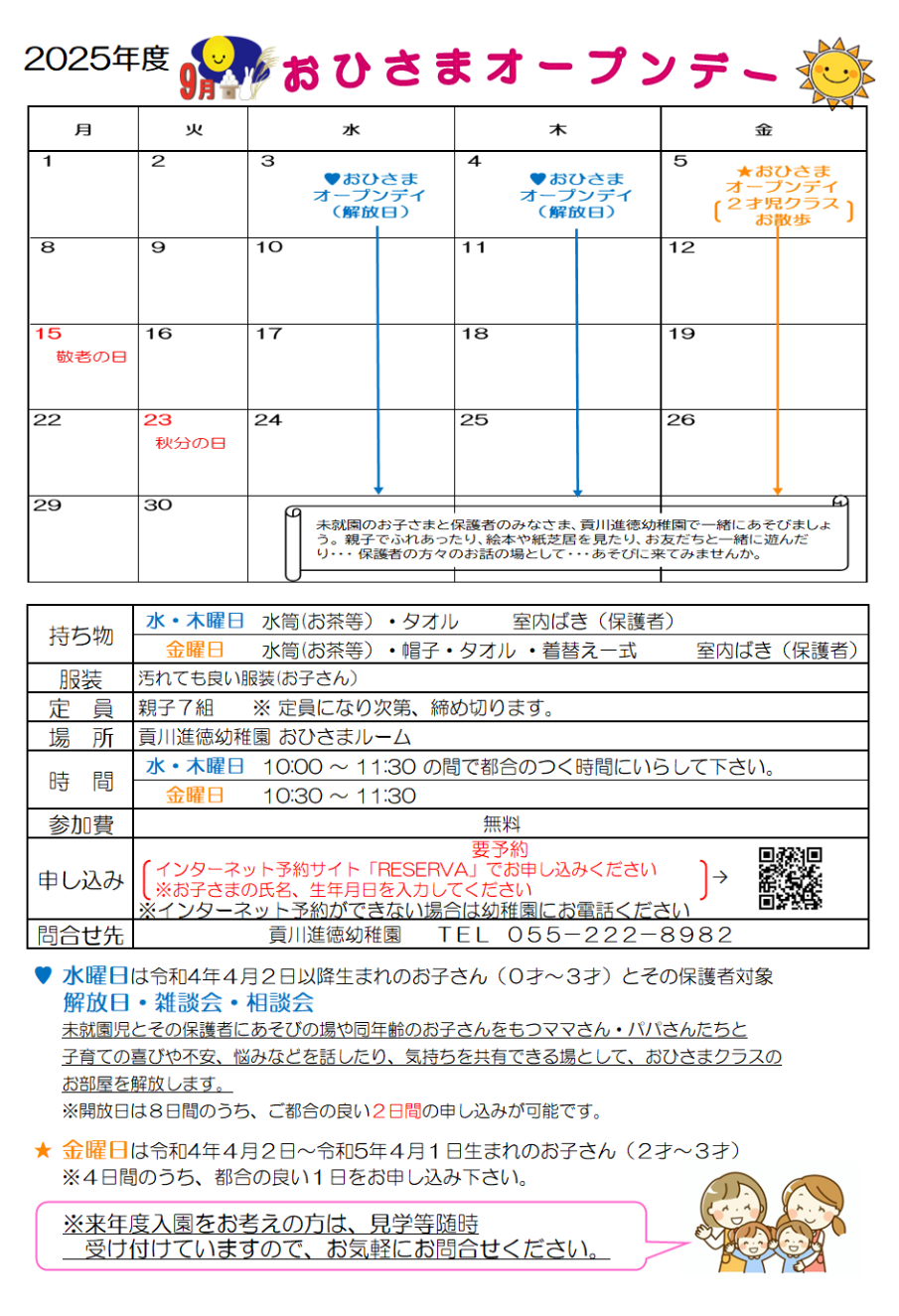 インターネットでの予約申し込みが出来ない場合は、幼稚園(055-222-8982)へご連絡いただければ、対応致します。