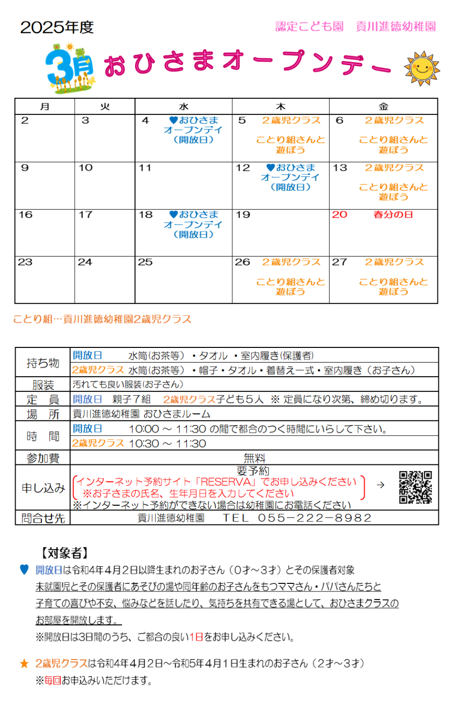 ・2歳児クラスに関しては、2月より、毎回お申し込みいただけます。