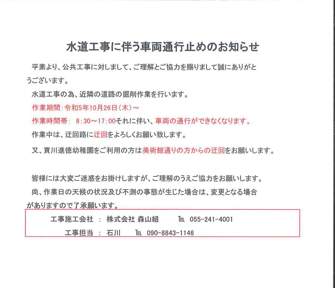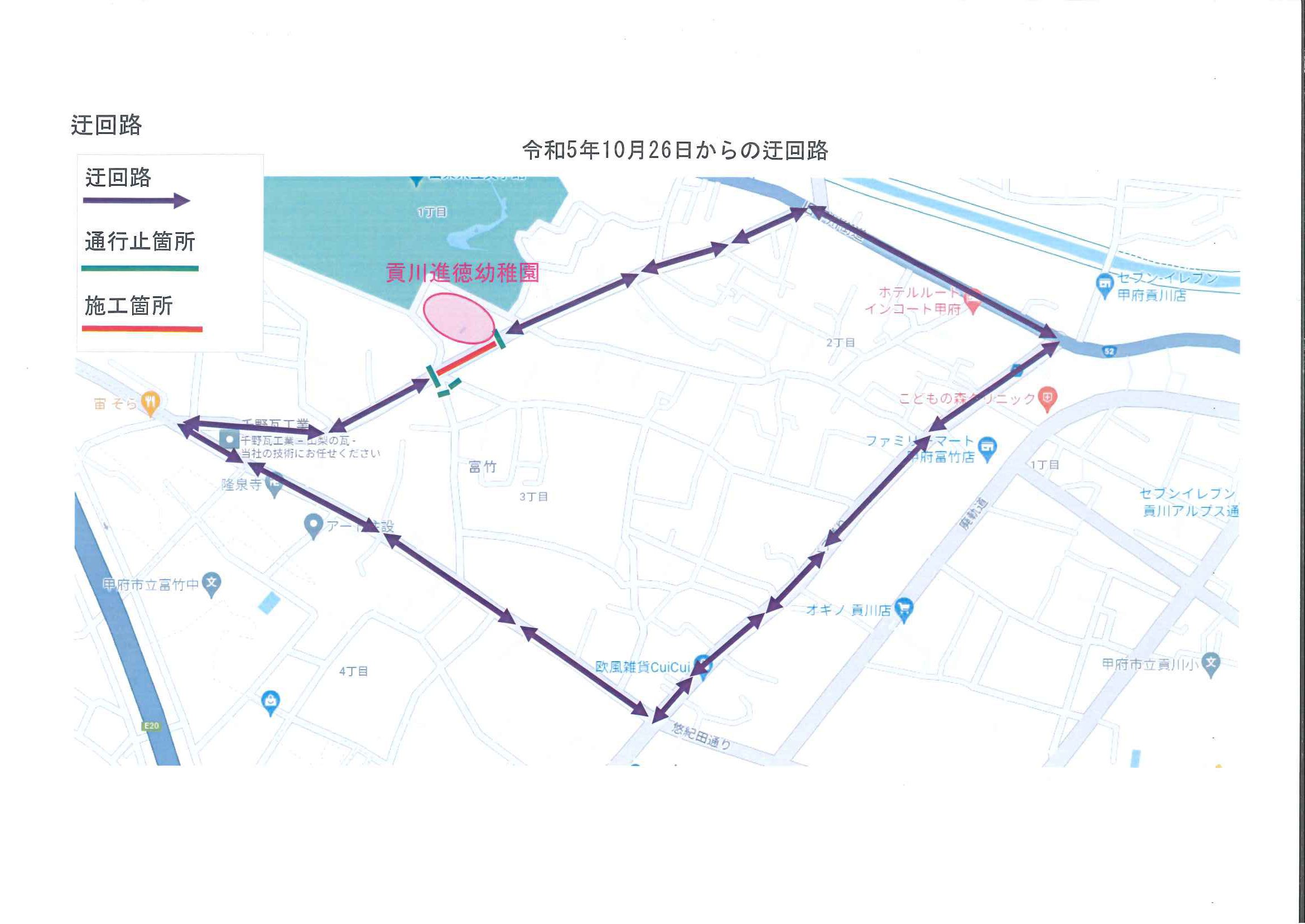 10月10日(火)より園の近隣で水道工事を行っていますが、明日10月26日(木)より通行止めの箇所が変わりますのでお知らせします。