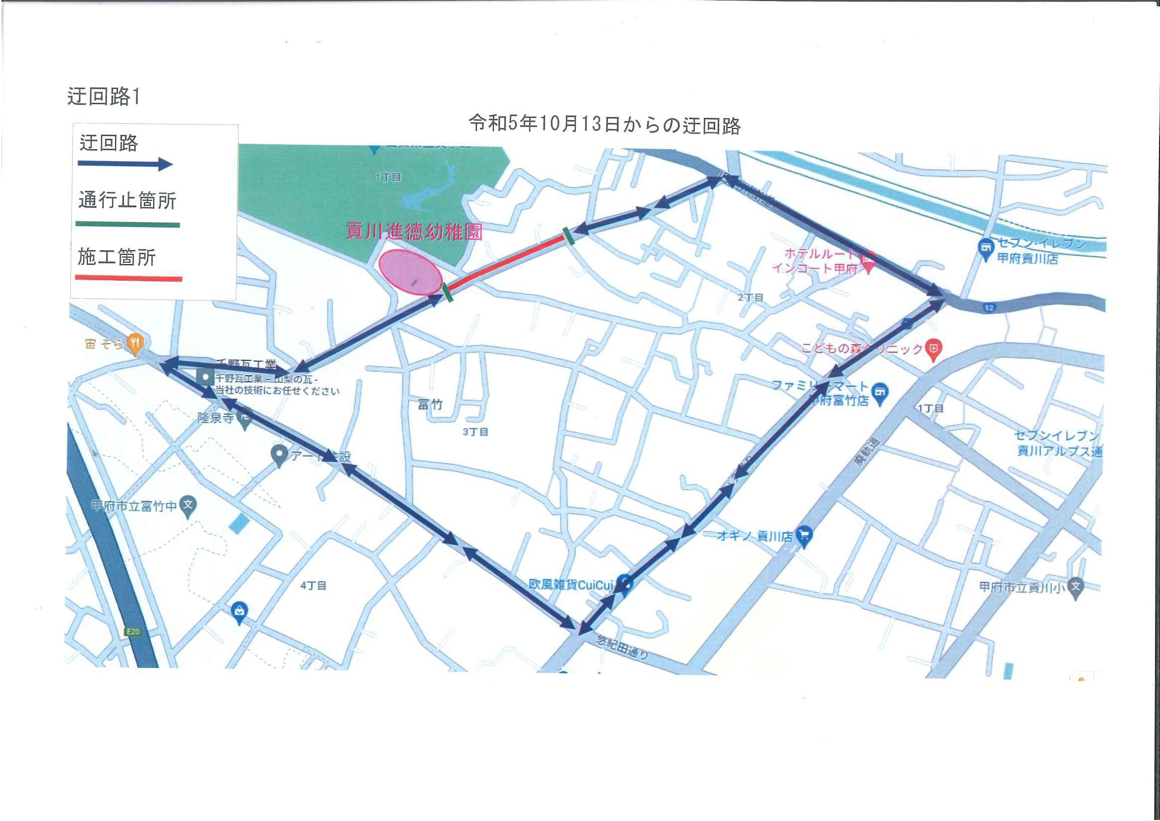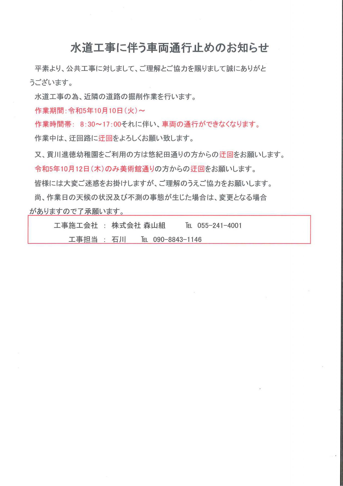 本日10月10日(火)より園の近隣で水道工事を行っており、日によって通行止めの箇所が変わりますのでお知らせします。
