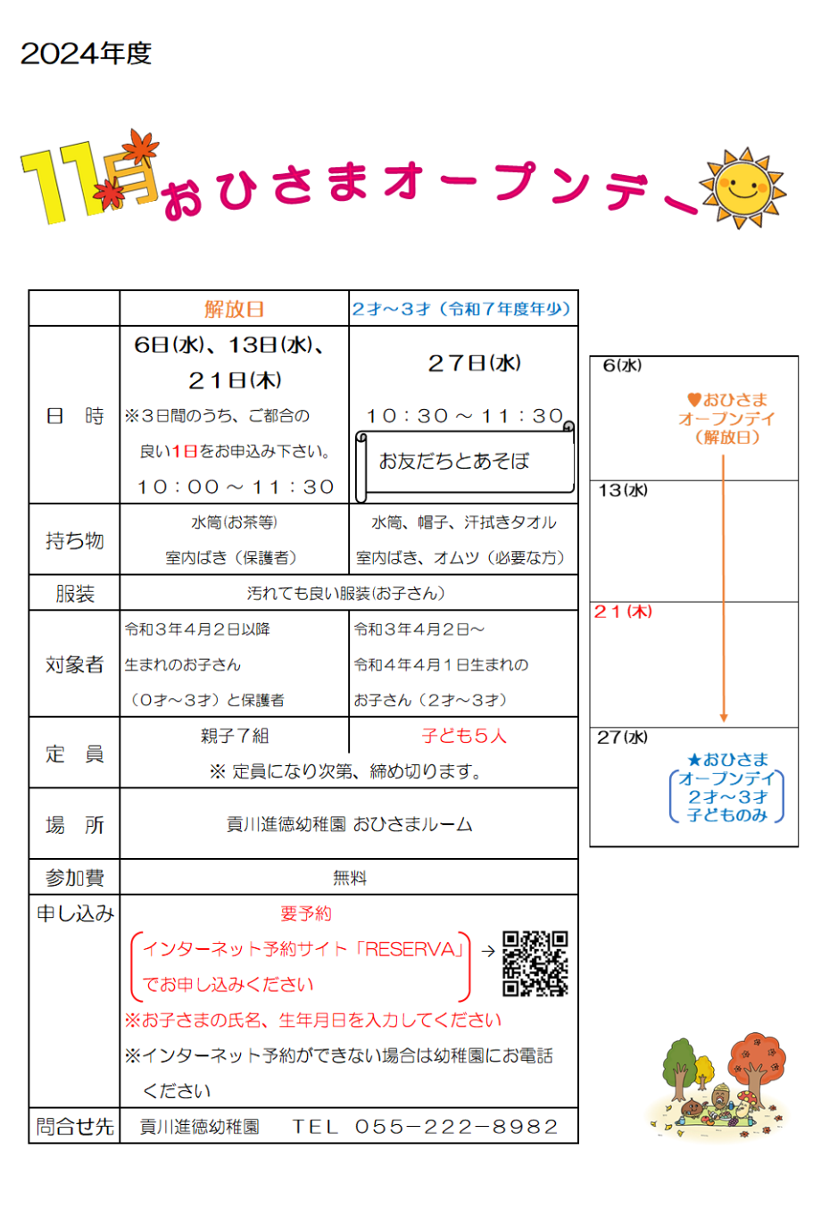 インターネットでの予約申し込みが出来ない場合は、幼稚園(055-222-8982)へお電話いただければ、対応致します。