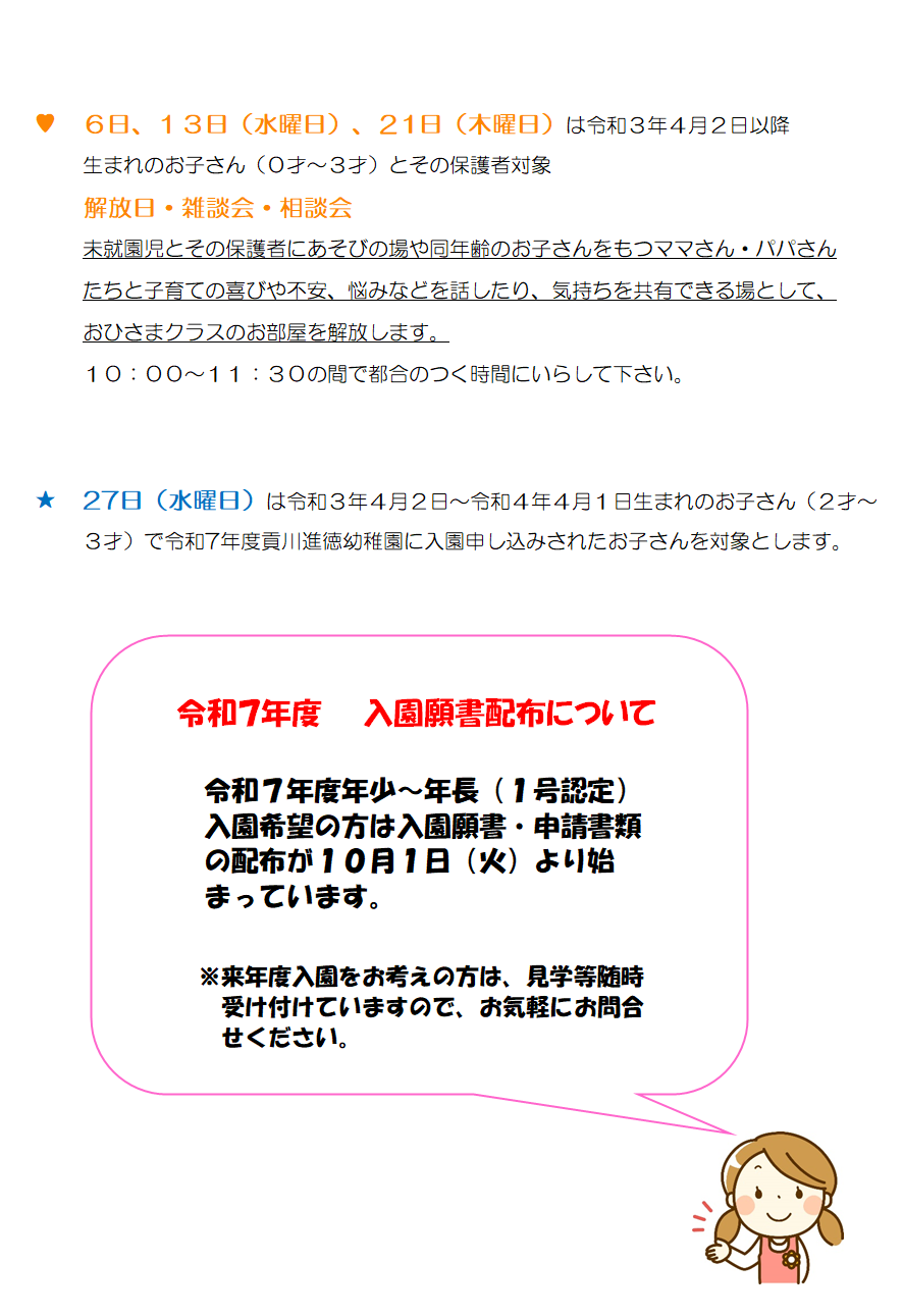 R3.4.2~R4.4.1生まれ(2~3歳)で、当園に令和7年度の入園申し込みされたお子さまを対象とします。