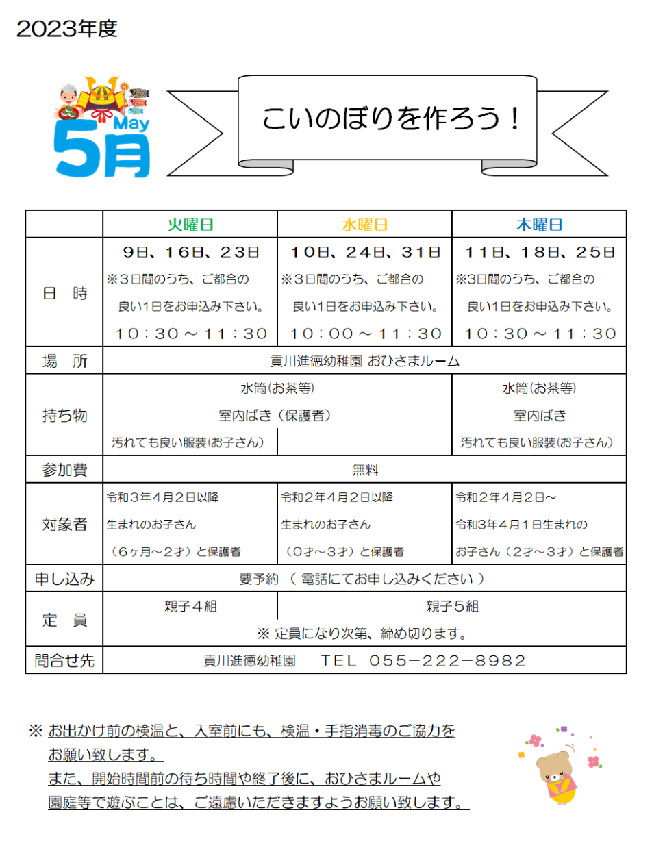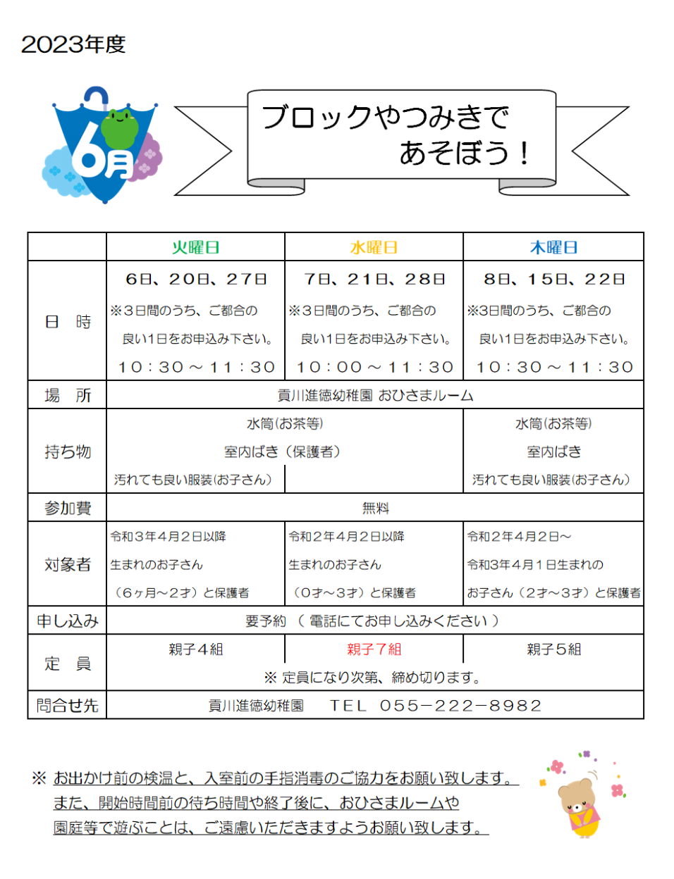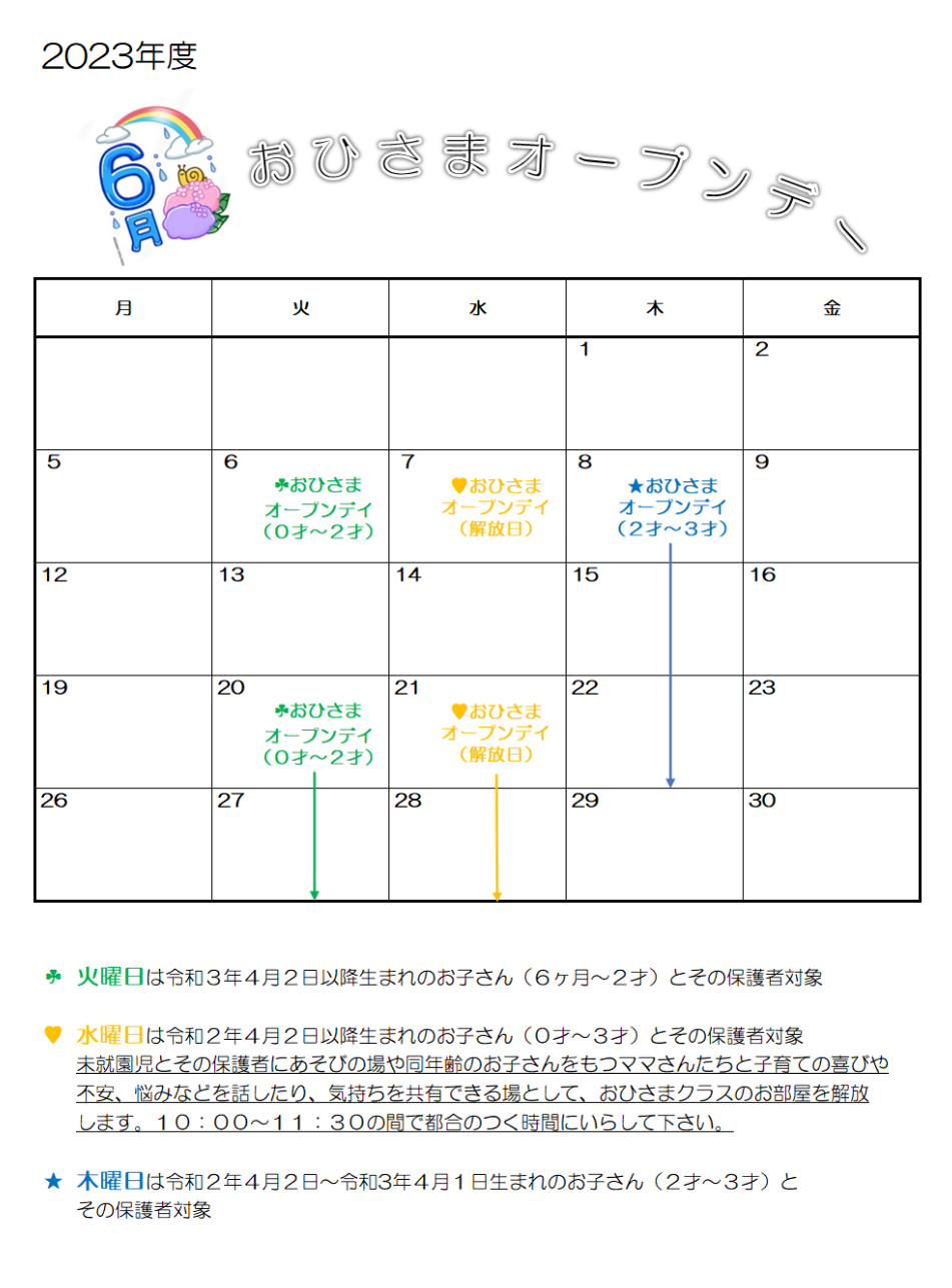 ※6/13(火)・14(水)は、園で保育参観があります。駐車場が混み合うことが予想される為、おひさまオープンデーの実施はありません。