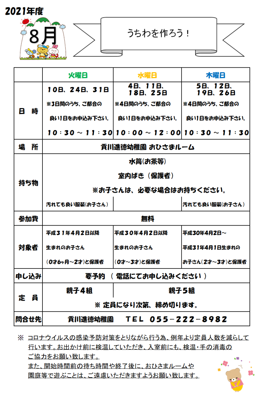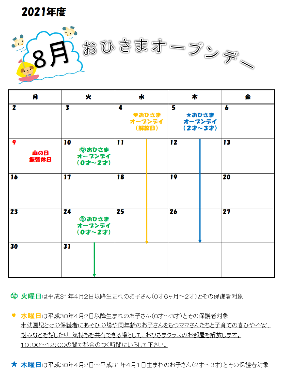 8月のおひさまオープンデーは、火曜日・水曜日・木曜日ともに申し込み数が定員に達しましたので、申し込みの受付を終了させていただきます。