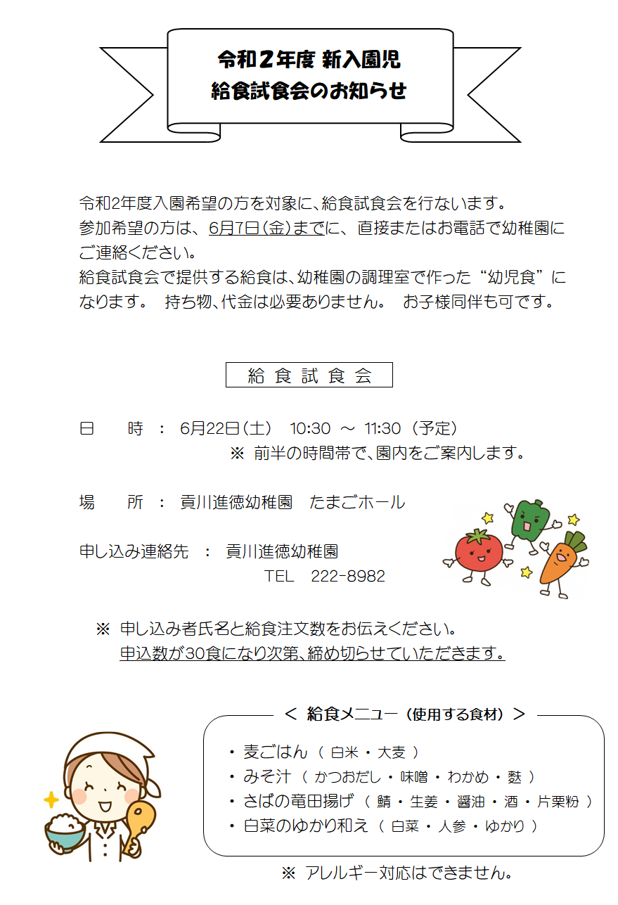 令和2年度の入園希望の方を対象に、給食試食会を行ないます。