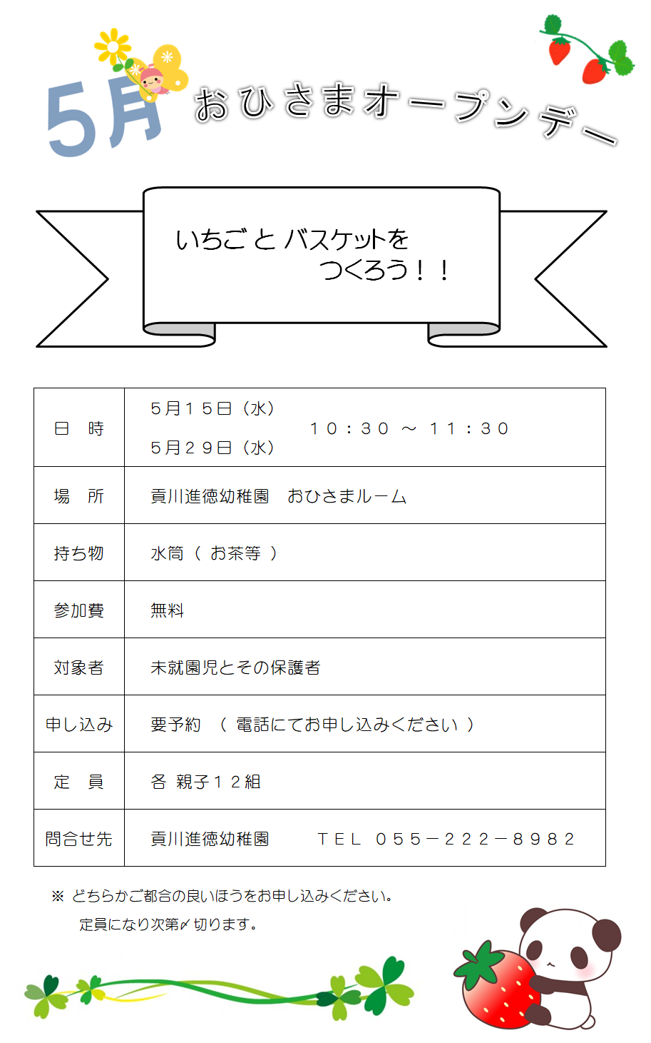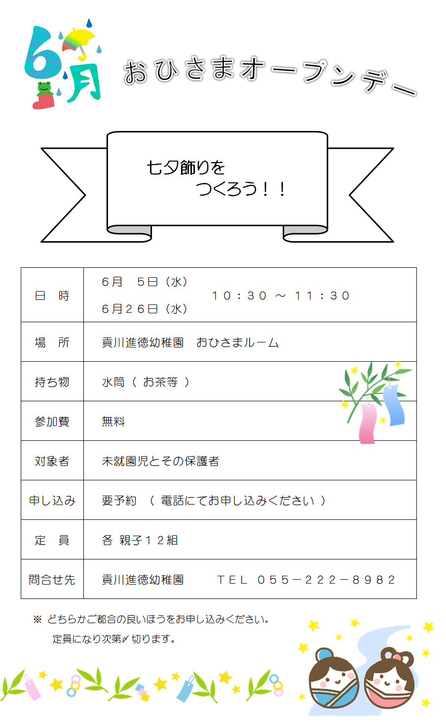 参加される方は、幼稚園へ電話にてお申し込みください。