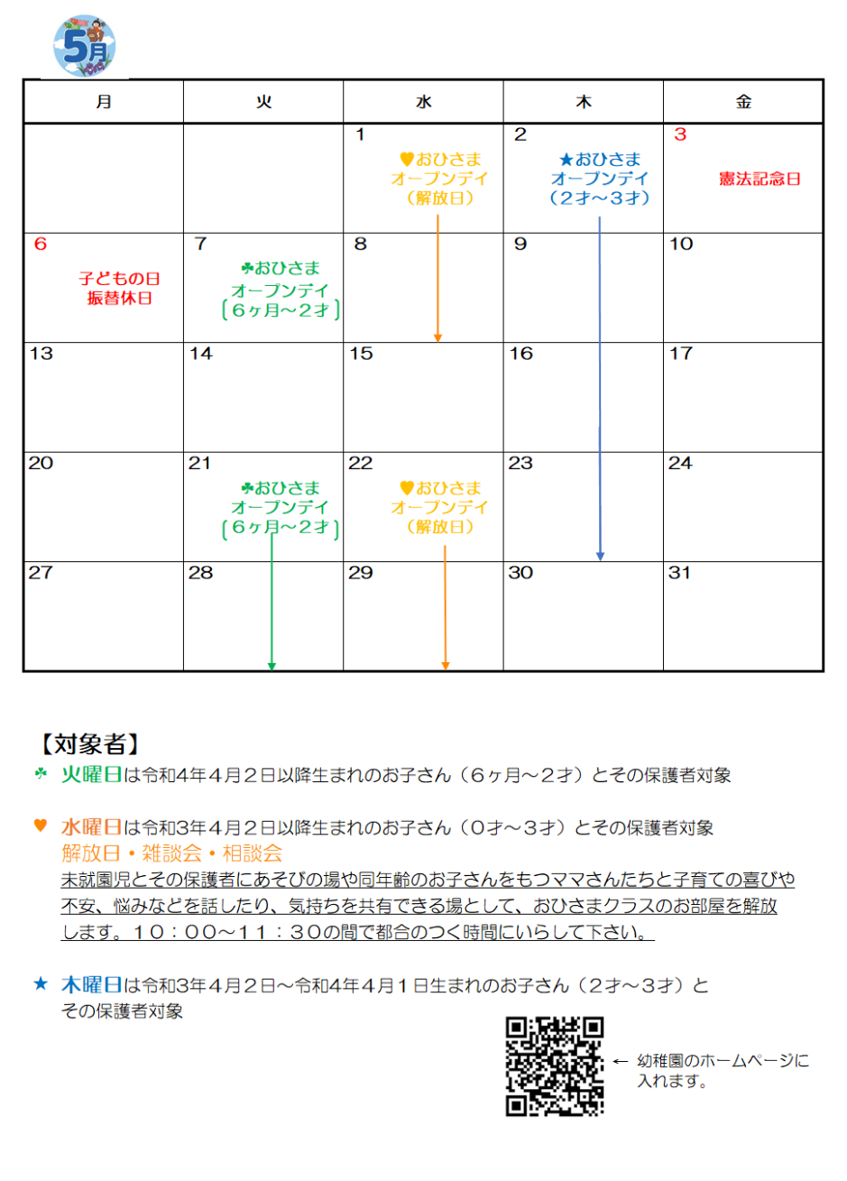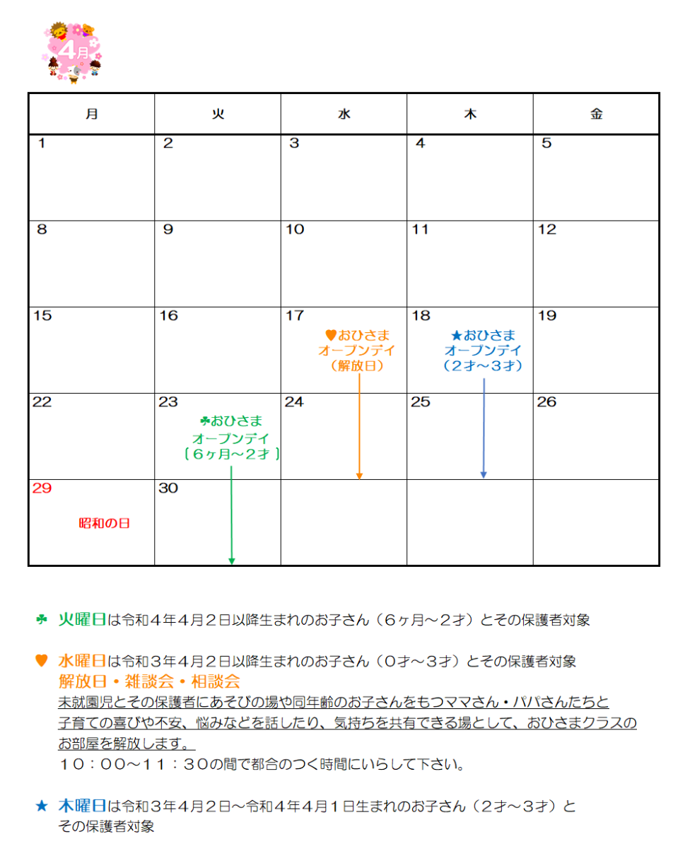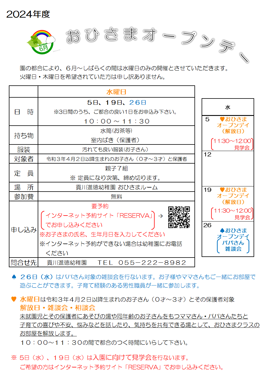 ◎園の都合により、6月からしばらくの間は水曜日のみの開催とさせていただきます。